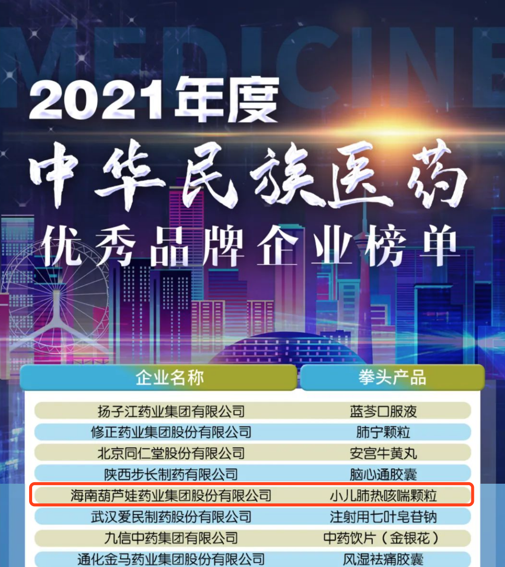 12月29日,全国工商联医药业商会发布了“2021年度中华民族医药优秀品牌企业榜单”,PT视讯药业集团凭借黄金单品小儿肺热咳喘颗粒(4克)实力登榜。